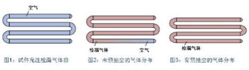 为正确试漏,在充注检漏气体前将试件预抽空是完全必要的,特别是对几何形状长和窄的试件尤为重要。如果充注前未抽空,试件中的空气将被挤压至几何空间的终端,而检漏气体不可能
