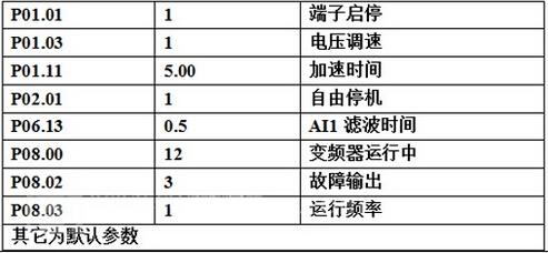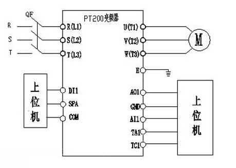 欧科PT200系列变频器采用高精度矢量控制,低频大转矩,多种频率给定通道,调速精度高达0.01HZ,宽范围载波可调,能使电机噪声更小,多功能数字输出通道,可根据具体要求设置参数功能,保护功能齐全,输入输出缺相保护,过流,过压,短路保护,让运行更加稳定安全。通过对现场的应用了解,利用变频器的外部端子控制启停,AI1给定频率,AO1反馈当前运行频率,SPA输出变频器运行信号,继电器功能设置为变频器故障输出。