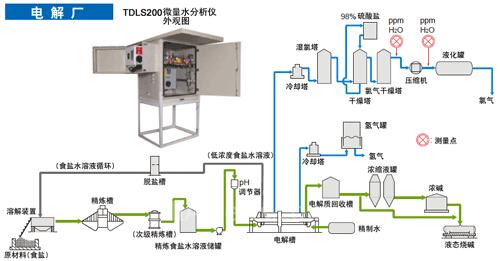 电解食盐水溶液装置的主要产物之一是氯气,如果经干燥塔后氯气中仍有水分残留,就会对下游的压缩机产生腐蚀、影响产品质量。所以在氯气进入压缩机前后都要对其含水量进行测量,以防止压缩机腐蚀及产品质量下降。传统的微量水分析仪使用五氧化二磷(P2O5)传感器测量工艺气体的含水量。由于测量时传感器与气体接触,会产生传感器损耗、响应速度变慢、维护运行成本增高等问题。现在,TDLS200激光分析仪可以成功的解决这些问题。