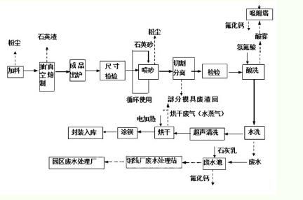 如图1所示:项目生产产品为石英圆坩埚,主要工艺步骤为模具加料、坩埚熔制炉熔制、成品出炉、尺寸检验、酸洗、水洗、超声清洗、涂钡、包装入库。具体介绍如下: