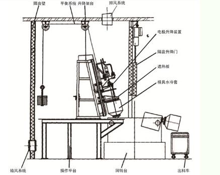 旋转成型和回转机构是将两个金属水冷套(内放石墨模)安放在一个大的回转盘上,已达到一个处在熔化过程中,另一个进行成型操作,从而可提高生产效率一倍。