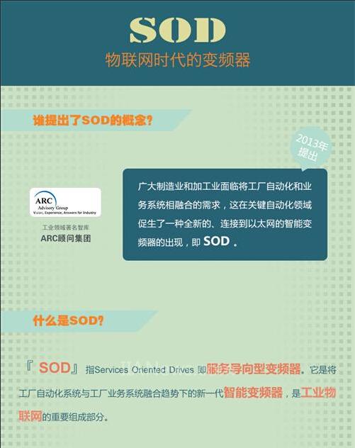 工业领域著名智库ARC顾问集团曾在其报告中指出:“广大制造业和加工业面临将工厂自动化和业务系统相融合的需求,这在关键自动化领域促生了一种全新的、连接到以太网的智能变频器的出现,即SOD”。SOD全称Services Oriented Drives,即服务导向型变频器,它是将工厂自动化系统与工厂业务系统融合趋势下的新一代智能变频器,是工业物联网的重要组成部分。