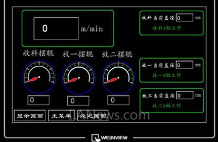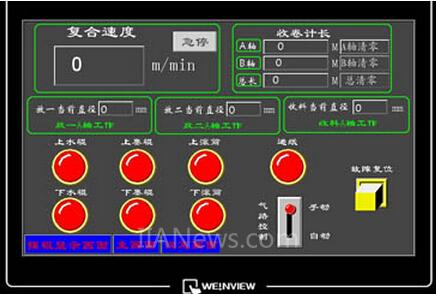 由于印刷机的长度过长,为了操作方便,在两个不同的位置各放置一个触摸屏:MT6100i和MT6070iH,在主人机界面(MT6100i)中,设计了4幅画面,包括整体图形、故障报警、机器速度和印刷控制。还有两个自动弹出窗用于对电子凸轮参数(Q00 PLC内部地址)的修改,实现在线控制;另一个触摸屏(MT6070iH)中,也设计了4幅画面,包括印刷控制、水辊速度显示、调版显示和计数控制。故障显示使用指示器,给出位元件即刻实现闪动效果,让操作者很方便的知道故障部位,整体感很好。在水辊速度显示中,设计了一个显示图,可以显示水量增加大小,同时也可以方便监控。
