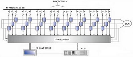 HARSVERT-A系列高压变频调速系统采用单元串联多电平技术,属“高-高”电压源型变频器,为单元串联多电平拓扑结构,主体结构由多组功率模块串联而成,从而由各组低压叠加而产生需要的高压输出,它对电网谐波污染小,总谐波畸变小于4%,直接满足IEEE519-1992的谐波抑制标准,输入功率因数高,不必采用输入谐波滤波器和功率因数补偿装置;输出波形质量好,不存在谐波引起的电机附加发热和转矩脉动、噪音、输出dv/dt、共模电压等问题,不必加输出滤波器,就可以使用普通的异步电机, 10kV每个系统共有24个功率单元,每8个功率单元串连构成一相,其系统结构如图1所示。