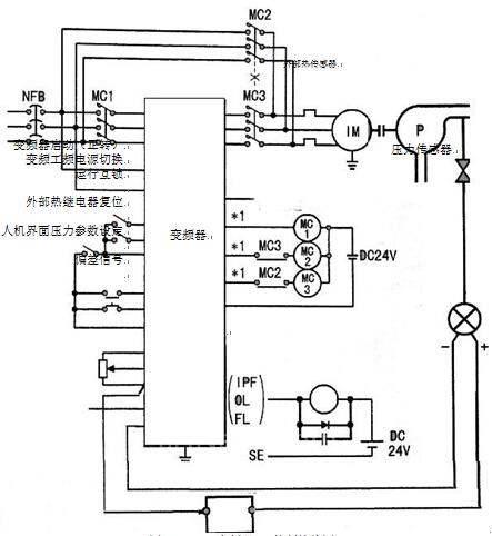 变频器的极限输出频率的检测输出信号、工频运行信号及变频运行信号等均接入PLC,作为增减机信号及执行PID控制的变频器控制信号。
