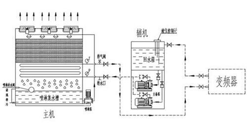将变频器的热风通过风道直接经过空-冷装置进行热交换,由交换器内部的冷却水管道与热空气进行非介质接触式交换,直接将变频器散失的热量带走,避免变频器对室内环境形成加热作用。空冷装置的供冷水温度不大于33℃时,即可保证热风经过热交换器后,将变频器室内的环境温度控制在不高于40℃。