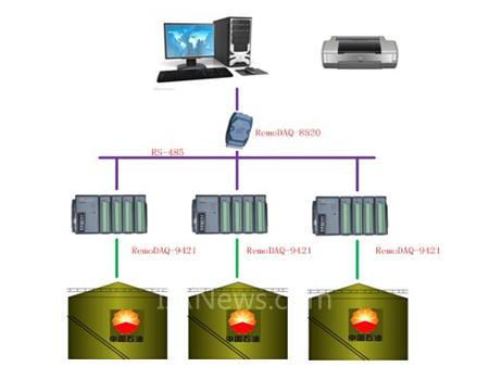 集智达和系统集成商设计了一个监控系统,完全满足客户的要求。系统围绕一个包括RemoDAQ-9421/485 分布式数据采集和控制系统的 RS-485 网络来设计,所有模块都连接到控制室的电脑上。每个RemoDAQ-9421/485 系统包含多达四个RemoDAQ-9421输入输出模块,许多模块具有多种功能,大多数模块的输入输出范围可以进行远程设置。系统集成商选择RemoDAQ-9017模拟量输入模块(设置它的可配置范围为 4-20 mA)来处理来自遍布储油站的压力发送机和压力差发送机的信号。经过RemoDAQ-9017处理的信号把每个油泵入口或进口的压力或者每个油料过滤器的压力差提供给控制室的设备操作员。选择 RemoDAQ-9018 处理油泵主轴温度的测量信号。选择RemoDAQ-9060继电器输出模块在温度或压力读数超出可接受的范围时触发控制室中的警报。每个模块插在 RemoDAQ-9421/485系统的扩展槽中,通过 RS-485 网络与控制室的电脑通信。RS-485 多点网络可以进行比较快速的远距离通信,是使用最广的工业现场总线。