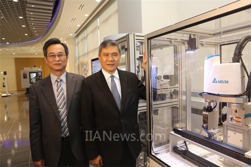 台达海英俊董事长 (右)与机电事业群张训海总经理展示台达多工机器人弹性工作站