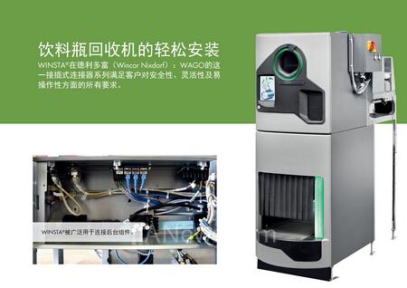 ■统一的饮料瓶有偿回收系统于2006年问世,在经历了最初的困难后,现如今早已开拓了强大的市场。为了便于回收,大多数商超引入了饮料瓶回收机,以方便顾客处置空瓶。该类设备的市场领导者之一—德利多富(Wincor Nixdorf)有限公司使用WAGO WINSTA®接插式连接器系列来进行电气安装。