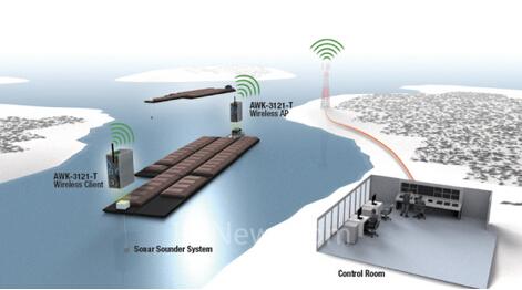 探测声波的回声仪实际安装在驳船的船体下方,用数米长的线缆与船头的回声箱连接。由于驳船的桥位于船尾,桥位和回声箱之间有一个长度近200英尺的货物甲板。为了了将回升箱与桥位相连,又不希望采用有线线缆带来诸多不便,因此在前甲板安装一台AWK-31221-T无线客户端与回声箱连接,另一台AWK-3121无线AP则安装在桥位用于接受来自回声探测仪的数据。