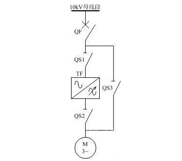 系统设计方案以“先保证系统安全可靠,结构合理,提供最佳性价比方案”的原则,针对性提出一拖一手动工/变频切换方案。正常运行时,系统通过QS1、QS2隔离开关将变频器接入电动机的一次动力系统中实现对电动机的调速控制;当变频器出现故障时,可断开QS1、QS2隔离开关,合上旁路开关QS3恢复电动机原有运行方式保证生产的连续性。具体一次系统电气原理图如下所示。