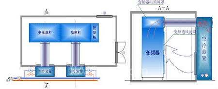 其主要原理是:将变频器的热风通过风道直接通过空冷装置进行热交换,由冷却水直接将变频器散失的热量带走;经过降温的冷风排回至室内。空冷装置内通过冷水温度低于33 ℃,即可以保证热风经过散热片后,将变频器室内的环境温度控制在40℃以下满足变频器对环境运行的要求。从而,保证了变频器室内良好的运行环境。冷却水与循环风完全分离,水管线在变频室外与高压设备明确分离,确保高压设备室不会受到防水、绝缘破坏等安全威胁和事故。