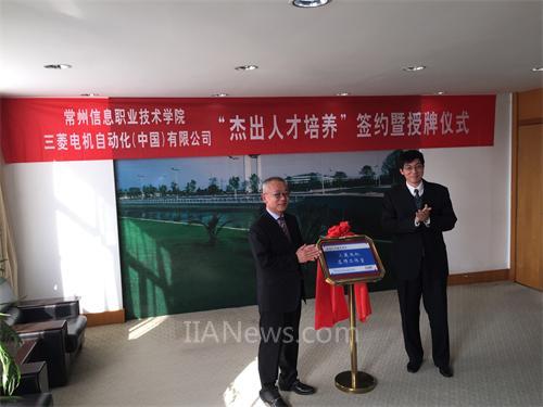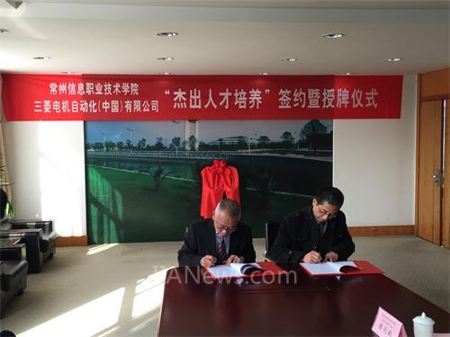 三菱电机自动化(中国)有限公司总裁城下雅纪,常州信息职业技术学院院长王丹中,副院长陈刚等出席了授牌仪式,陈刚副院长和城下雅纪总裁分别代表校企双方签署“杰出人才培养”合作协议书。