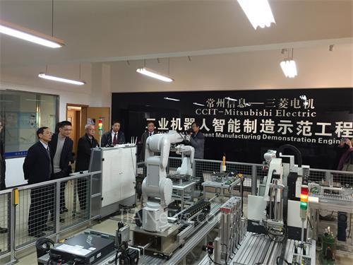 城下雅纪总裁一行在机电工程学院负责人和老师的陪同下,参观了位于学院工业中心的三菱电机FA实验室和工业机器人智能制造示范中心。