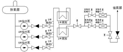 给水泵的任务是将除氧器贮水箱内的具有一定温度的给水,通过给水泵产生足够的压力打入汽包,汽包内汽液分离,水送入热锅炉,在锅炉环冷壁中加热产生蒸汽后进入蒸汽轮机作功,带动发电机组发电。根据电能生产的特点和热锅炉运行的特殊要求,给水泵必须连续不断地运行。这不仅关系到正常发电,而且也直接关系到锅炉设备的安全。因此,锅炉给水泵在发电厂是最为重要的水泵,号称发电机组的心脏。给水泵工艺流程如下图1所示: