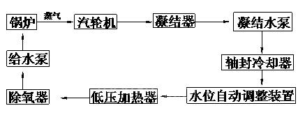 汽轮机做功后的尾气大部分蒸气被凝结器循环冷却水冷凝成水,凝结水进入热井中,由凝结泵(两用一备)抽出,经轴封冷却器和水位自动调整装置后,一部分通过低压加热器经过加热后送至除氧器;另一部分通过再循环调节阀回到热井中,保证热井液位。凝结水泵工艺流程图如下图2所示: