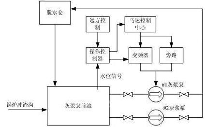 灰浆泵是根据前池液面的高度决定启、停电机。这样就存在两方面问题:一方面为了适应生产工艺要求,需要每天根据前池液位和冲灰管的需要不断切换、启停电机,前池液位高度得不到很好控制,而且频繁工频启动电机对电机造成很大冲击。灰浆泵工艺流程图如下图3所示: