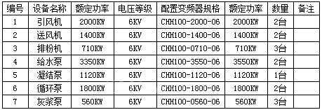根据山西某发电厂一期一台300MW机组主辅助设备的现场的额定参数和实际运行工况,再结合英威腾公司CHH100系列高压变频器在其它工程地应用情况,我公司所配置变频器如下表2: