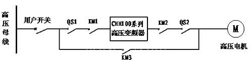 根据现场的额定参数和实际运行工况,再结合我公司的CHH100系列高压变频器在其它工程应用情况,我方提供的CHH100变频器的旁路系统采用一拖一自动方案,变频器具有转速跟踪功能,变频与工频能够自动切换,其一次系统如下图所示: