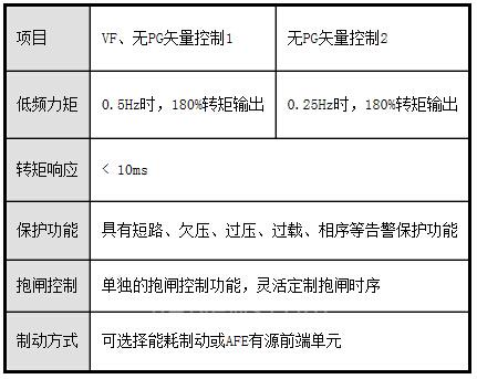 该变频器具有专业的抱闸时序设计,以及完善的保护功能,如:具有输出短路、过压、欠压、过热、过载、缺相、通讯、编码器断线等保护。