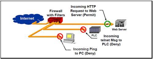 防火墙是一种机制,用于控制和监视网络上来往的信息流,目的是保护网络上的设备。流过的信息要与预定义的安全标准或政策进行比较,丢弃不符合政策要求的信息。实际上,它是一个过滤器,阻止了不必要的网络流量,限制了受保护网络与其它网络(如因特网,或站点网络的另一部分)之间通信的数量和类型。下图显示了一个简单的防火墙,禁止来自因特网对个人计算机(PC)和可编程逻辑控制器(PLC)的访问,但允许对企业Web服务器的访问。