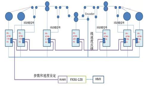 系统由七台电机传动控制,分别为两个收卷(A740 -7.5K-A1)、两个放卷(A740 -7.5K-A1)、主机(A740-22K-CHT)和收、放卷牵引(A740 -3.7K-A1 )构成,其中收卷、放卷和收、放卷牵引的浮辊信号分别直接接到各自的变频,由各自变频内置的浮辊运算模块分别并行运算控制。如图所示: