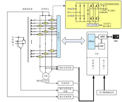 电网电压经主变压器隔离移相后为功率单元供电,每个功率单元为一个单相交-直-交电压型逆变器,单元串联星接后形成三相变频电源给高压电动机供电。根据串联单元级数的不同,产品分为3kV、6kV、10kV三个系列。主变压器采用移相整流方式,输入功率因数高,输入电压电流谐波小。满足IEEE519-1992和GB/T 14549-93对电压和电流最严格的谐波失真要求。无需任何功因补偿和谐波抑制装置。变频器输出采用多重化PWM技术,输出为近乎完美的正弦波,无须加输出滤器。电动机谐波损耗小,转矩脉动小,无明显电动机噪声。电动机不需降额使用。输出dV/dt和共模电压小,对电动机无附加电应力损害。