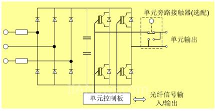 功率单元采用三相交流输入,整流滤波后形成直流电压,经IGBT H桥逆变后输出脉宽调制(PWM)电压。功率单元控制板由IGBT驱动电路和监测保护电路、光纤通信电路、单元旁路电路和控制电源组成。运行中功率单元故障时,变频器可将故障单元自动旁路并继续运行,等情况允许时再停机排除故障。