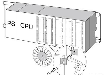 (2)将插槽号贴到模块上。先把相应的插槽号拿到相关模块前,然后将卡舌放置到模块 ① 的开口中,最后将插槽号压入模块 ② 中,插槽号从轮子处断开。图6说明了此过程。