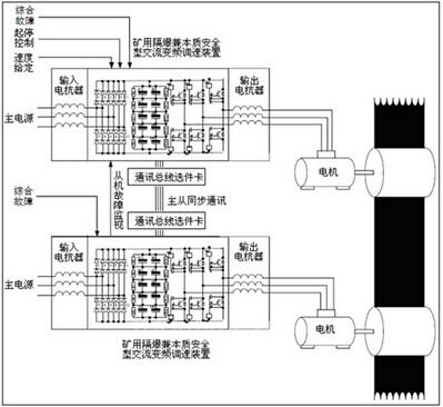 防爆变频器带动胶带输送机工作时,采用主从联动方式。主机的输出作为从机的给定,从机跟踪主机的主参数,主从机的数据交换通过通讯线路进行。具体可以根据胶带输送机机械驱动装置的布置作调整。