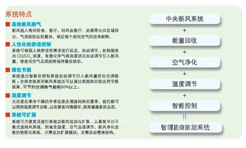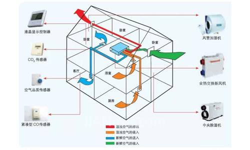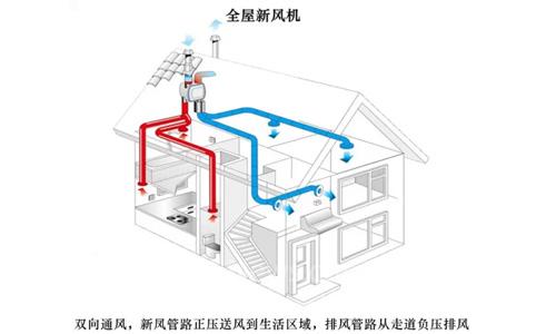 全屋每个房间都有新风送入,压力平衡双风机系统,从室外引入的新风和从室内排出的回风气流经过新风机热交换核芯,相互之间不直接接触;冬季利用室内排风量里的热量来加热室外引入的低温新风,夏季利用室内排风量里的冷量来冷却从室温外引入的高温新风。