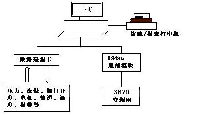 模拟量数据采集卡将压力、流量、阀门开度、电机温度和管道温度等模拟信号转换成12位的数字信号,每一路信号占用数据采集卡上一个模拟通道,互不影响,采样周期为300ms。SB70变频器支持RS485半双工串行通讯方式,通过在工控机上用IP函数或VB的MSCDMM通讯控件编制串行通讯程序,即可实现工控机与变频器之间的通讯,本系统用VB的通讯控件编制。将采集到的数据信号,经实时分析处理后,通过组态王监控画面,监测现场传输的实时数据和历史数据及设备的运行状况、历史曲线的分析、实时报表、历史报表的打印、声光报警等。