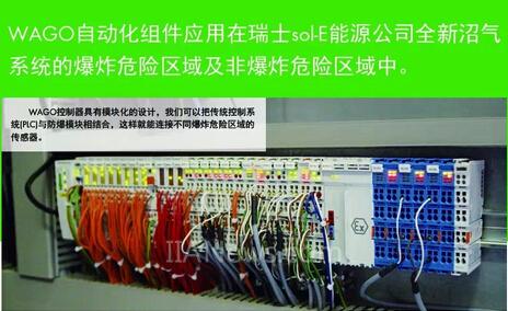 ■瑞士s o l - E 能源公司( B K W 集团子公司) 已在弗鲁蒂根污水处理厂旁边投资建设了新的沼气系统。该公司首先从污水处理产生的污泥中生产沼气,然后用于发电。在有爆炸危险的区域,WAGO控制器可始终确保系统的正常运行。