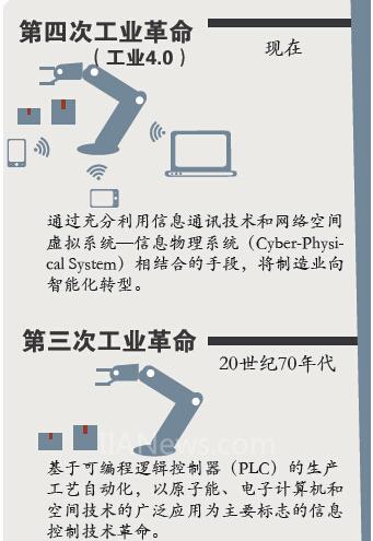 工业4.0的基础,是已经实现的前三次工业革命。按一般的划分,第一次工业革命开始于18世纪后半叶,其主要标志是以蒸汽机的发明带来的机械化生产;第二次工业革命开始于19世纪后半叶,主要标志是以电力的发明带来的电气化和大规模流水线生产;第三次工业革命开始于20世纪后半叶,主要标志是通过信息技术和电气化的结合实现的自动化生产。第四次工业革命,从现在开始,其主要特征就是综合利用第一次和第二次工业革命创造的“物理系统”和第三次工业革命带来的日益完备的“信息系统”,通过两者的融合,实现智能化生产。
