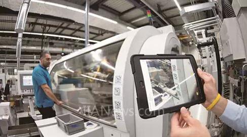 ▲在巴登符腾堡州的一家齿轮工厂,一名工作人员正拿着平板电脑扫描机器上的二维码,机器上的操作指南可以直接通过数码设备阅读。