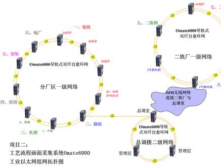 主厂区采用10台Omate6000以太网交换机组成光纤自愈环网,与10个点的原有的以太网交换机通过百兆电口相连,组成主厂区一级网络。二铁厂采用6台Omate6000以太网交换机组成光纤自愈环网,与6个点的原有的以太网交换机通过百兆电口相连,组成二铁厂一级网络。总调室大楼采用3台Omate6000以太网交换机组成光纤自愈环网,与3个点的原有的以太网交换机通过百兆电口相连,组成总调室大楼二级网络。主厂区一级网络与总调室二级网络组成相切环,也就是在环与环直接通过光缆连接。二铁厂一级网络通过54M的无线网络与总调室大楼二级网络相连。