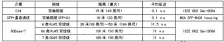 随着交换标准的成熟和铜缆标准的改进,在万兆以太网上使用铜缆变得越来越普遍。现在,万兆以太网有三个不同的铜缆技术。每种都有不同的价格和性能(详见表5)。尽管光纤(SFP+模块)能提供最低的延时,但是许多IT部门还是使用铜缆来连接交换机到交换机或者交换机到服务器。