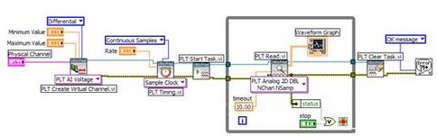 凌华科技为 PCI-9846提供了LabVIEW驱动。安装DAQPilot驱动程序后,在LabVIEW的函数库中可以找到DAQPilot工具包,其中提供了数据采集的控制函数,其功能与调用方法与NI的DAQmax对应,使用非常方便。例如,由下图中的四个函数:PLT Create Virtual Channel、PLT Timing、PLT Read以及PLT Clear Task就构成了完整的连续数据采集功能。另外,DAQPilot中还提供了模拟和数字信号的输入、输出等各种功能的LabVIEW范例程序,方便开发者快速上手。