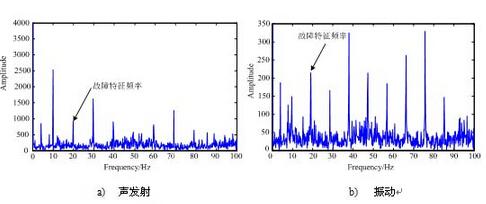 在轴承座上与轴心对应的垂直位置安装传感器。振动测试系统由加速度传感器、NI USB9234动态信号采集器组成,振动数据导入MATLAB进行分析。在保证转速不变的情况下,在加速度传感器的安装位置安装声发射传感器,使用本文的声发射测试系统进行数据采集,将存储的数据导入到MATLAB中进行分析。图4中给出了声发射与振动加速度信号的对比,从图中可以看出,滚子表面缺陷产生的声发射信号信噪比远高于振动加速度信号。图5给出了两种信号经窄带滤波后的包络频谱图,可以看到,声发射信号的包络谱谱线结构较为简单,更容易找出故障的特征频率。