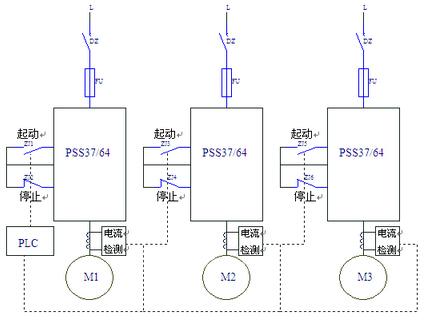 考虑到取水站无人值守,选择启动设备时着重可靠性,就选用软启动器,每台水泵配1台,共3台。沉淀池内设有“高”、“中”、“低”3个水位点,用PLC根据沉淀池水位的高低来决定1台水泵运行或2台水泵运行,还可通过编程控制使3台水泵使用的时间尽量相同。水泵的运行信号、故障信号通过电缆送到水处理站显示。取水站的抽水水位比水泵安装位置低2米,水泵初次起动或停止后再起动,都可能形成“真空”而吸不上水,原来的方式是靠人工注水。无人值守后必须自动地完成注水排气这个过程,其方法是采用间接检测方式,即检测水泵电机的运行电流。如果管道有“真空”,则电机近似于空载运行,电流较小;如果管道没有“真空”,则电机接近满载运行,电流基本上为额定电流,二者的差值较大。用电流检测来确定电机或抽水管道有无真空,如有问题,PLC给出报警信号,通知值班人员处理。