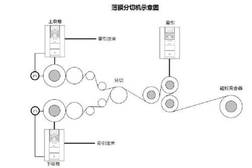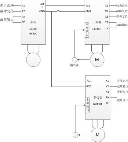 收卷部分由两台电机分别控制上下收卷轴,采用吉泰科GK800T系列张力控制专用,带卷径计算专用驱动器,自动计算当前卷径及所需收卷张力。牵引为整机设定基准速度,并将牵引线速度通过模拟口传递给收卷部分,可放卷部分张力由磁粉离合器控制。