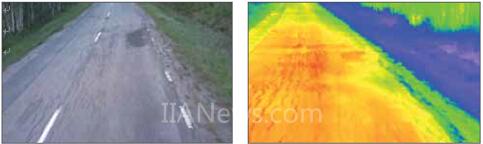 路面质量佳的道路(左图)生成一致的热图像,而右侧的热图像显示出裂缝迹象和沥青中的渗水情况。