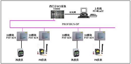 在传感器方面,该项目选择了美国奥利龙的2106HL浊度分析仪以及奥利龙的2102pH分析仪。这两种设备能够有效的测量PH值以及浊度。并且将测量值,以4-20mA的电流信号输出。另外,由于该项目中采用了西门子的T3000作为整个生产线的DCS系统。为将此电流信号传送到DCS系统中,还需要一个能够接收模拟量信号的设备。并且,该设备要支持DP通讯,这样有利于整个控制系统的简化。另外,项目中还需要有可视化界面,以便对整个控制系统进行监控。