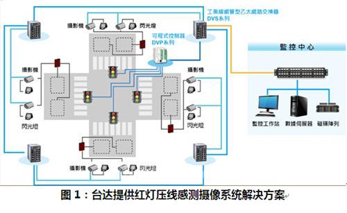 台达提供红灯压线感测摄像系统解决方案,通过网络串联感应、监测系统,进行十字路口红灯压线违规监测管理。详见图1。
