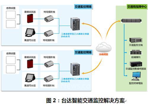 台达智能交通监控解决方案采用台达工业级网管型以太网交换机DVS系统,具有耐温性高及备用电力设计,串联光纤网络进行高效信息传输,大幅提升系统可靠度及安全性,是完美的一体化交通监控解决方案。详见图2。