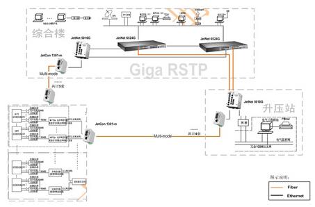 基于冗余及带宽需求,特选用korenix(科洛理思) JetNet 6524G全千兆3层网管型工业以太网交换机,作为综合楼内核心接入交换机,连接工作站,本地交换机,路由器及现场级交换机等设备。现场每10套太阳能电池方阵为一个区域单元,通过JetCon 1301-m光电信号转换器将这些分散的方阵,连接到区域交换机JetNet 5010G,实现百兆下连,千兆上连。升压站电气监控网也通过JetNet 5010G接入千兆干网。