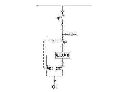 系统配备手动旁路柜中,共有3个高压隔离开关,为了确保不向变频器输出端反送电,QS21与QS22采用一个双刀双掷隔离开关,实现自然机械互锁。当QS1、QS22闭合,QS21断开时,电机变频运行;当QS1、QS22断开,QS21闭合时,电机工频运行,此时变频器从高压中隔离出来,便于检修、维护和调试。
