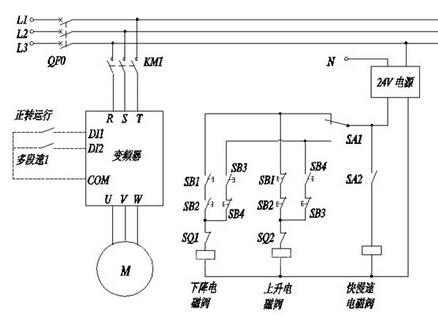 接线图说明:DI1接KM1常开点 ,DI2接下降继电器KA常开点,SB1/SB2防压手下降按钮,SB3手动下降按钮,SB4手动上升按钮,SA1手动自动切换,SA2快慢速切换,SQ1下限行程,SQ2上限行程。