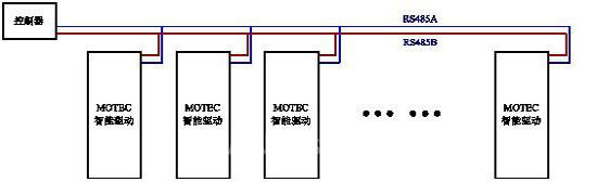 以下是MOTEC智能驱动器通过RS485网络控制的一种拓扑图。
