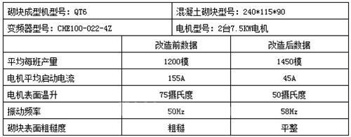 我公司研发及技术人员经多次现场调试,根据振动系统的运动特性,在公司原有CHE系列矢量变频器的基础上作了相应的软件及硬件改进,从而开发出了CHE系列砖机专用变频器。该系列变频器最大的特点就是能够在满足振动技术要求的前提下,省去制动单元及制动电阻。目前该系列砖机专用变频器已成功应用于泉州某工程机械有限公司,以下是该公司生产的砌块成型机,在使用了CHE系列专用变频器进行前后的生产数据对比: